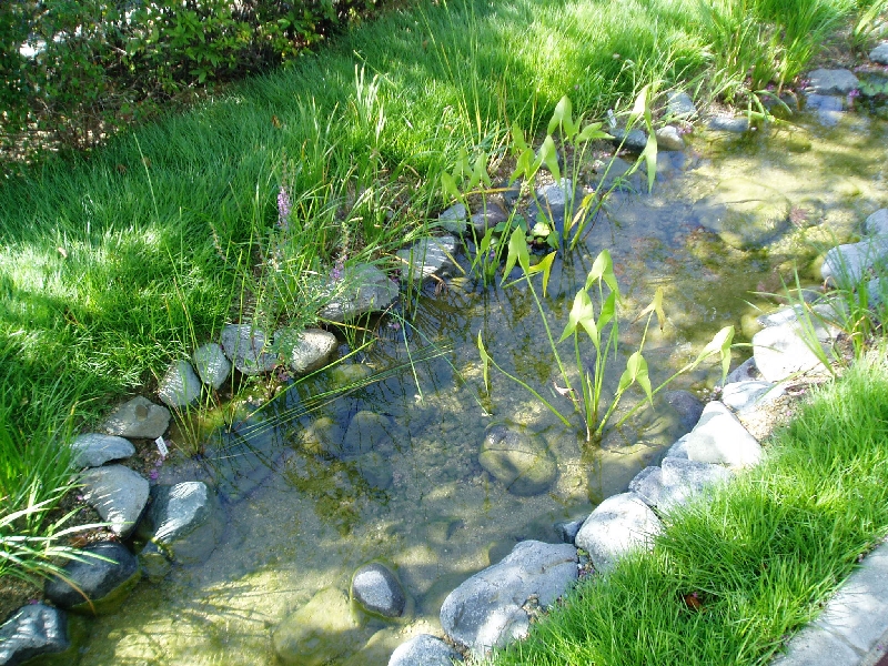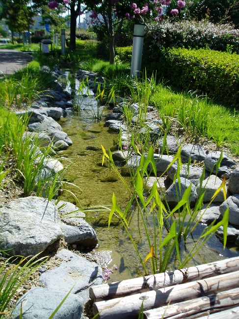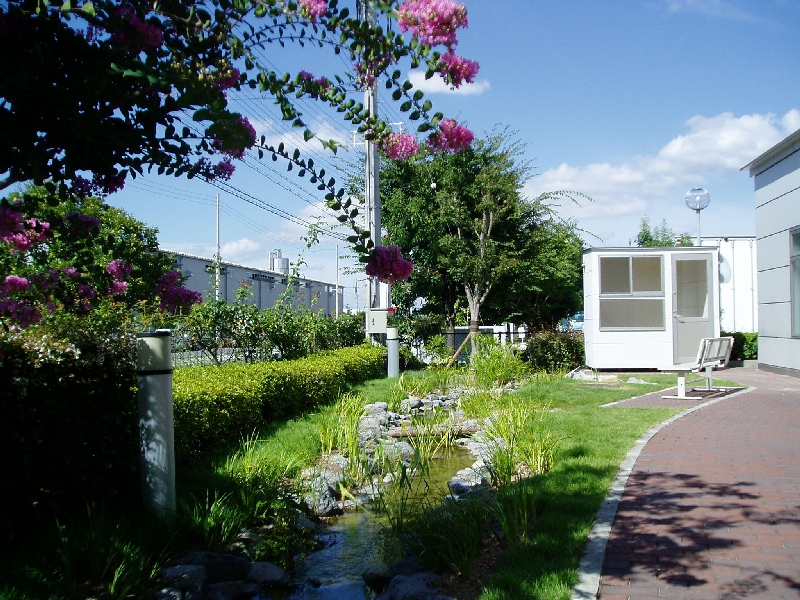 芝生と樹木の一般的な社屋庭園から、ビオトープ*1のある、社員の方や来訪者の憩いの庭に改修しました。できるだけ自然度の高いビオトープ空間を造るという趣旨のもと、見事なソメイヨシノやサルスベリ等の既存樹木はできるだけ残し、コンクリート等の人工的な材料はなるべく使用せずに石や土で川の流れを造りました。新たに植えた植栽は帰化植物を避け、周辺地域に自生する在来種でなおかつレッドデータブック掲載種を避けて構成しています。(アゼスゲ・ミゾソバ・ミソハギ・セリ・カンガレイ・オモダカ・エビモ・ヒシ等)埋め立て地という人工的な環境の中で、心安らぐ潤いのある空間になりました。